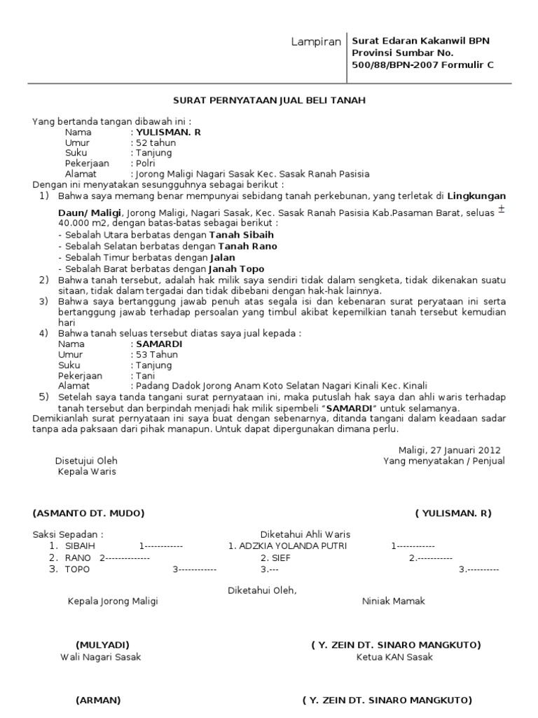 Surat perjanjian kerja sama atau contoh surat perjanjian jual beli tanah merupakan dokumen penting saat berikut ini saya berikan contoh surat jual beli tanah yang baik dan benar. 6000 dan diketahui dan ditandatangani oleh namun, surat kuasa ahli waris tak hanya berbicara tenang harta saja namun juga terkait utang piutang. Oleh karena itu diperlukan surat perjanjian jual beli rumah seperti contoh berikut. Tanah tersebut telah mutlak dijual oleh pihak pertama kepada pihak kedua yang disetujui oleh semua ahli waris dari pihak. Penjelasan lengkap seputar contoh surat jual beli tanah.