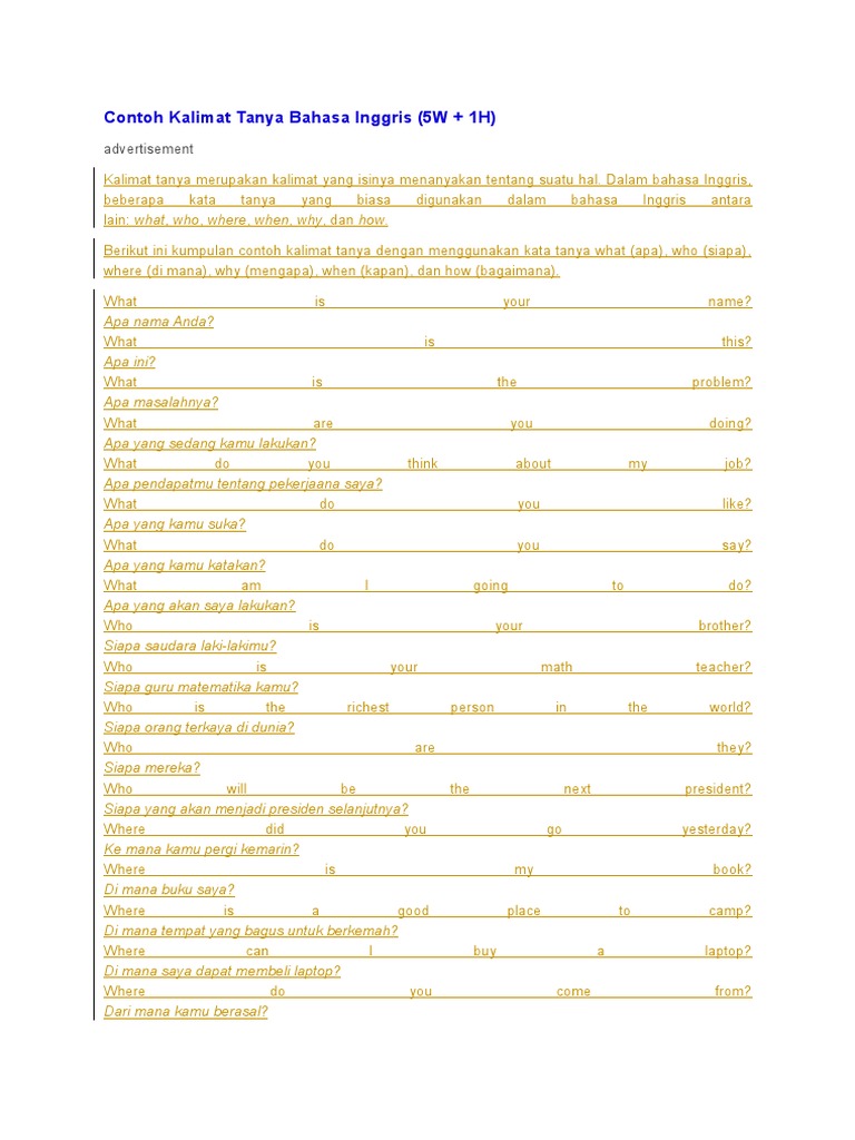 Buat kalimat dalam bahasa inggris menggunakan 5w1h. Kata tanya dalam bahasa inggris ini bisa tersusun dari rumus 5w+1h (dengan menggunakan who, whose, whom, what, when, where, why, which, dan how) ada banyak cara menyusun kalimat tanya bahasa inggris yang perlu anda ketahui. Dalam bahasa inggris dikenal dengan turn taking yang sama artinya dengan aksi dan reaksi atau timbal balik. 5w + 1h memudahkan anda untuk seperti yang sudah dijelaskan sebelumnya, di dalam bahasa inggris ada tujuh jenis kosakata pertanyaan yang harus anda kuasai agar anda dapat. Ada beberapa jenis kalimat tanya dalam bahasa inggris yang bisa kamu terapkan, lcers.
